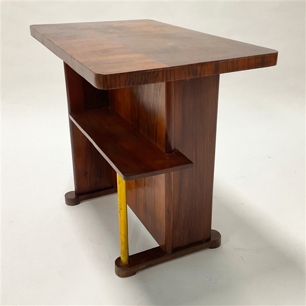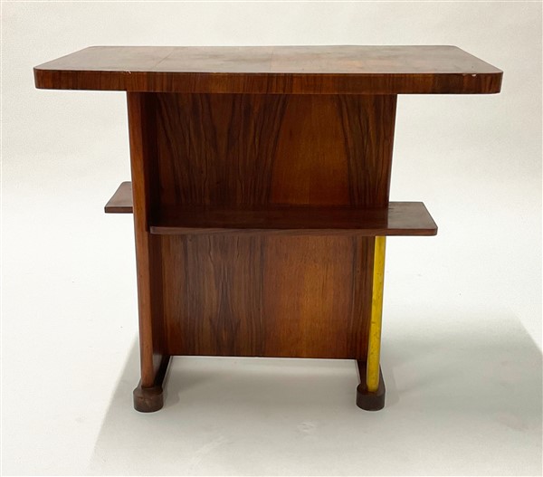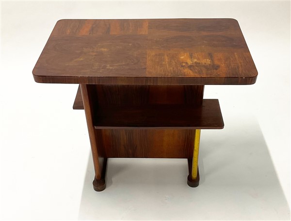 Tavolino in legno massello impiallacciato con ripiani inferiori asimmetrici retti da un tubolare in ottone (cm 80x47x48). Italia, anni '40/'50. (difetti e restauri)