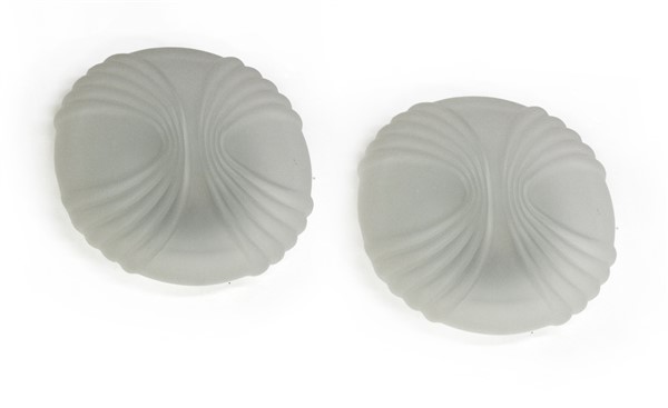 * Coppia di plafoniere con struttura in metallo verniciato bianco e paralume in vetro satinato soffiato in stampo. Italia, anni '70. (d cm 40)