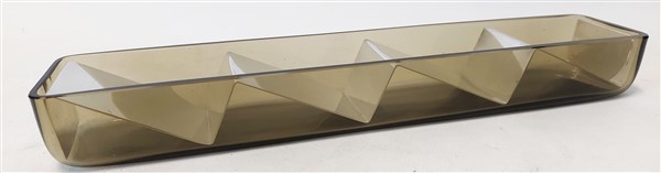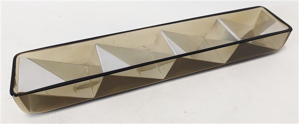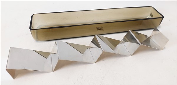 Contenitore da scrivania in metallo argentato e vetro. Produzione Sabattini, Bregnano, anni '70. (cm 40x5x7,5)