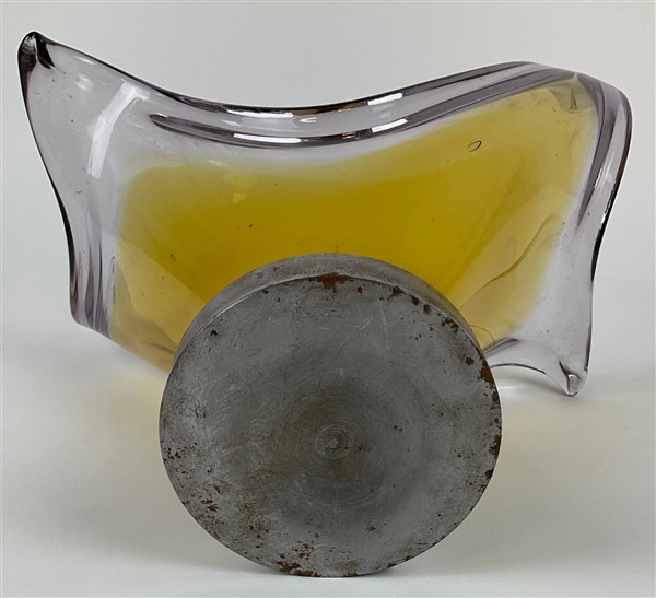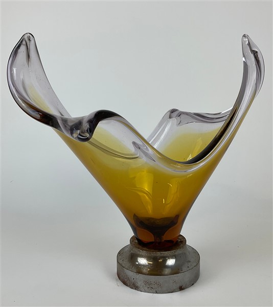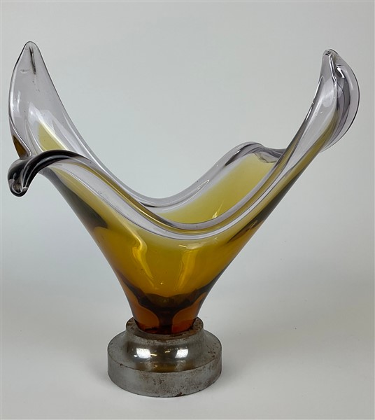 Coppa in vetro sommerso incolore arancione trasparente montato su base in acciaio. Anni '70. (difetti)