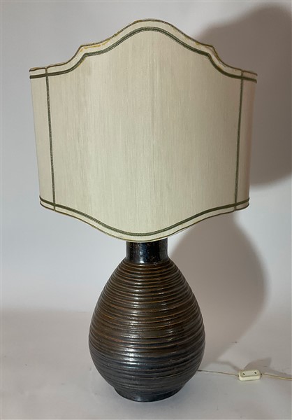 Lampada in terracotta lavorata al tornio smaltata nero e arancio con superficie scanalata. Italia, anni '80. (h con paralume cm 86) (difetti)