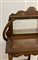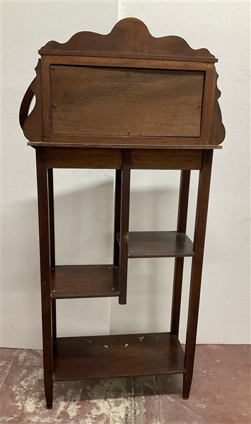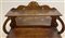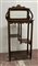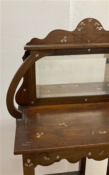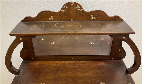 Etagère Liberty a quattro ripiani con specchio nella parte superiore. Struttura in legno massello intarsiato con motivi floreali a linea- frusta in ottone e madreperla. Italia, 1900ca. (cm 68x134x30) (difetti)