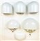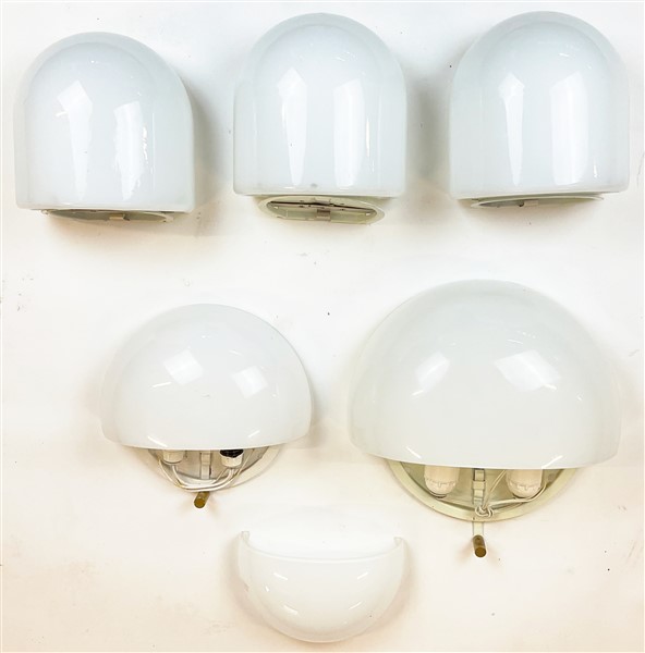 Due applique in vetro incamiciato lattimo e metallo laccato bianco e ottone modello "Mania". Produzione Artemide. Unite a tre applique in vetro incamiciato lattimo di diversa manifattura. (misure diverse) (lievi difetti e mancanze)