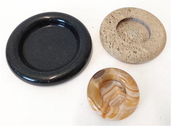 Lotto di tre posacenere in pietra dura, una con etichetta adesiva UP&UP. (d max