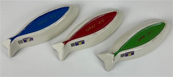 Lotto di tre contenitori a forma di pesce in ceramica smaltata rosso, verde e blu. Produzione Pozzi Ginori, Italia, seconda metà secolo XX.