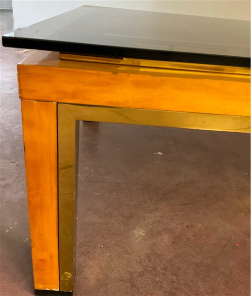 Tavolo da salotto in legno e ottone, piano in vetro fumé. Italia, anni '70. (cm 140x40x75) (lievi difetti)