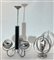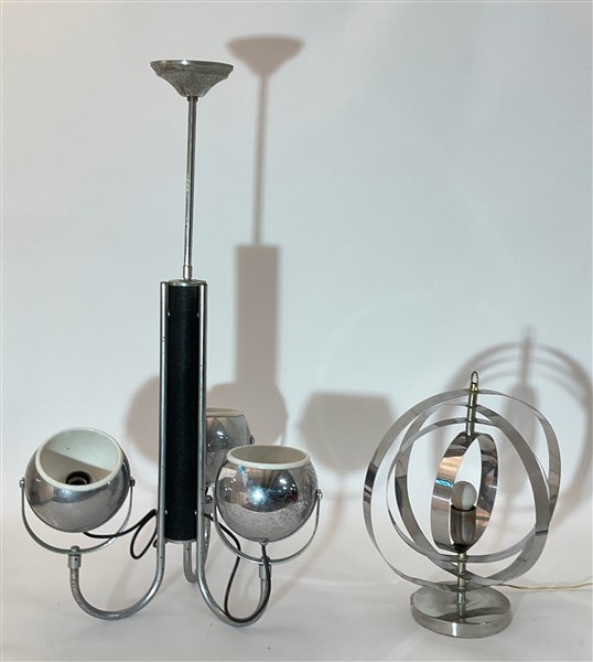 Lotto composto da una lampada a sospensione a tre luci in metallo cromato unito a una lampada da tavolo in metallo cromato. Secolo XX. (difetti e modifiche)