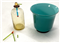 Venini, piccolo vaso della serie "Opalini", Murano, 1989. Vetro incamiciato verde smeraldo. Firmato e datato a punta sotto la base, unito a una bottiglietta in vetro trasparente pagliesco, decorata con applicazioni a caldo policrome. Firmato a punta alla base. (h cm 10,5)