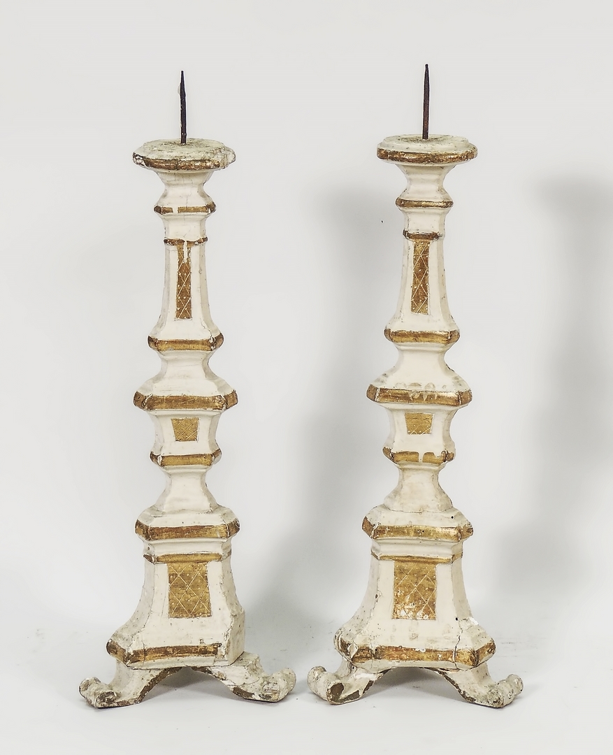 COPPIA DI TORCIERE IN LEGNO INTAGLIATO, LACCATO E IN PARTE DORATO - PAIR OF LACQUERED AND PARTIALLY GILTWOOD PRICKETS Toscana, XVIII secolo - Tuscany, 18th Century fusto a balaustro, base triangolare su tre piedini a ricciolo, difetti h cm 53,5