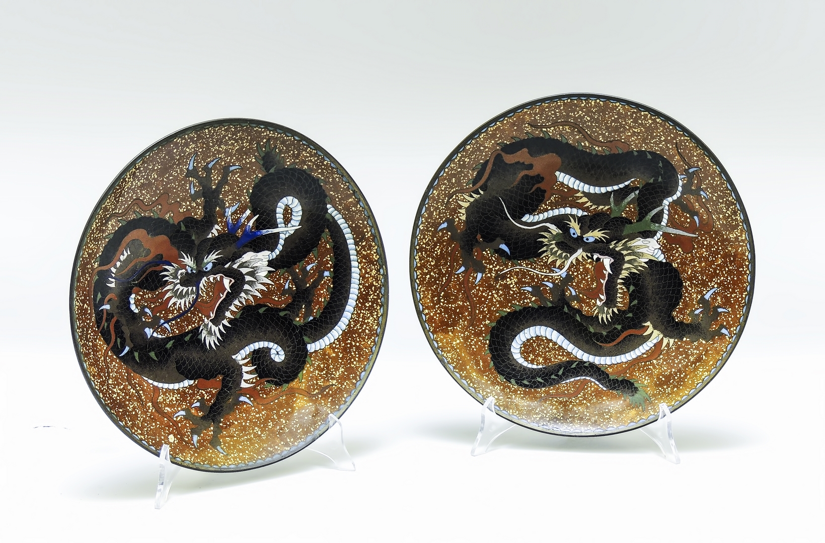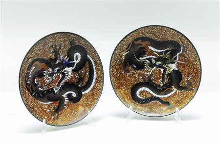 COPPIA DI PIATTI IN SMALTO CLOISONNÉ - PAIR OF CLOISONNE ENAMEL PLATES Cina, fine del XIX secolo - China, late 19th Century con draghi su fondo a finto porfido, al verso decorazione con motivo di squame diam cm 31