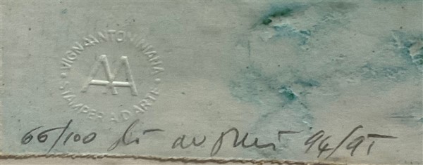 Firmata, numerata 66/100 e iscritta in basso a matita, timbro a secco Stamperia d'Arte Vigna Antoniniana in basso a sinistra. In cornice (difetti)