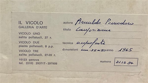 Arnaldo Pomodoro "Composizione" 1965 acquaforte foglio cm 50x35; lastra cm 30,5x
