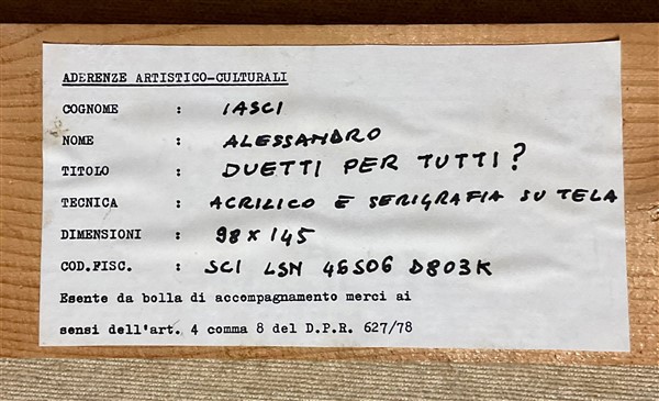 Alessandro Jasci "Duetti per tutti?" acrilico, serigrafia e collage su tela cm