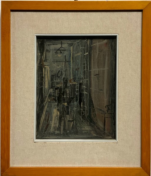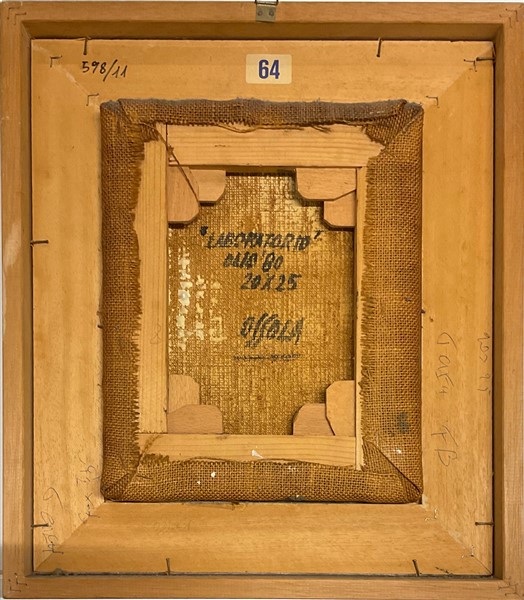 Giancarlo Ossola "Laboratorio" 1980 olio su tela cm 25x20 titolato, datato e fir