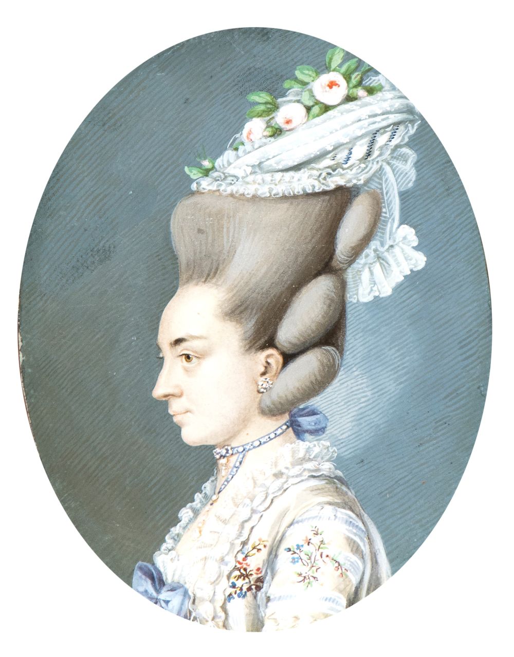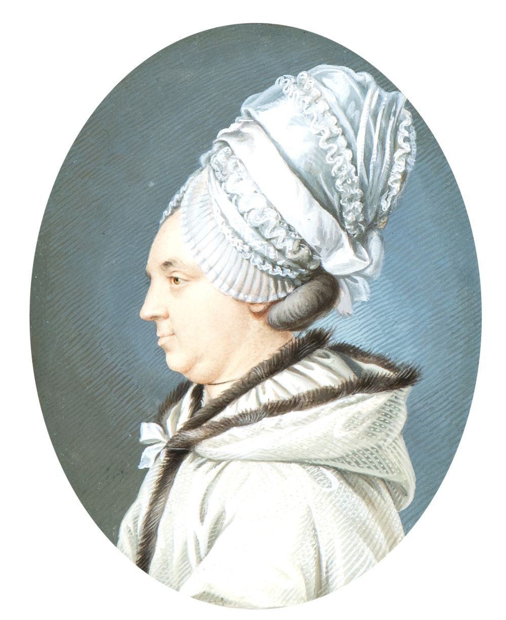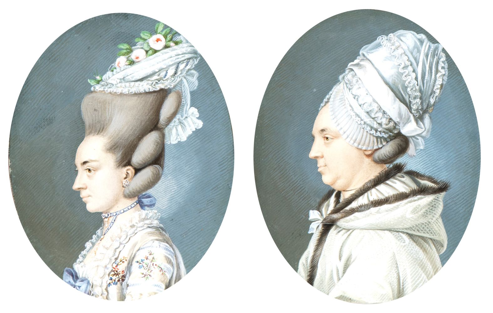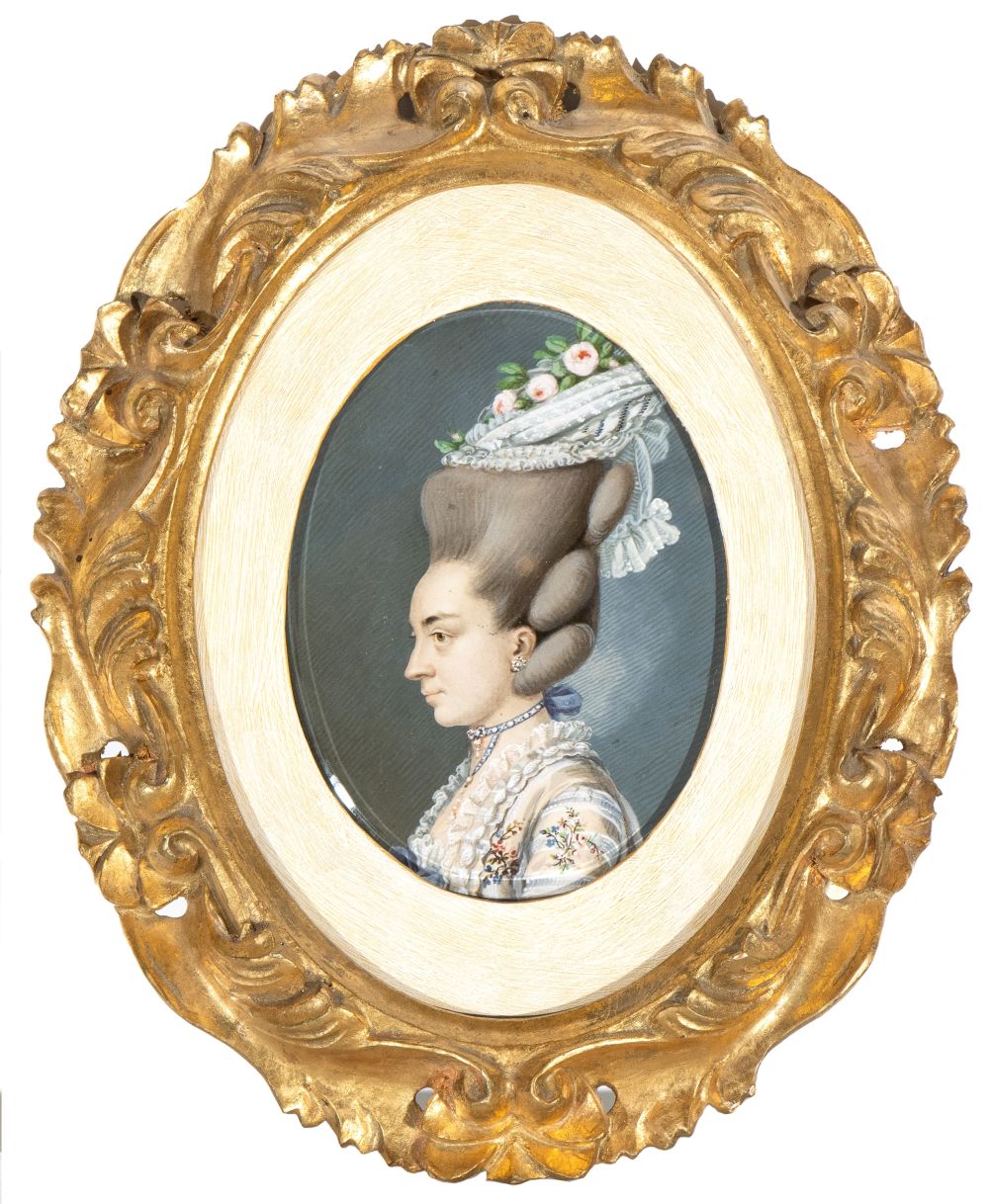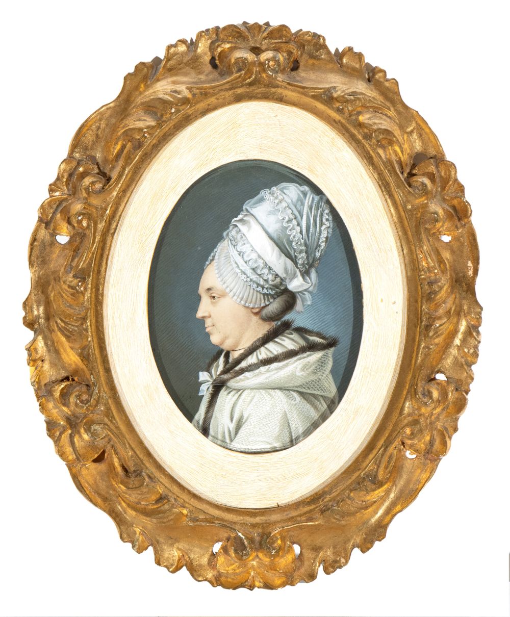 a) Ritratto di profilo di gentildonna con cuffia; b) Ritratto di profilo di giovane gentildonna con orecchini e collana. Coppia di miniature