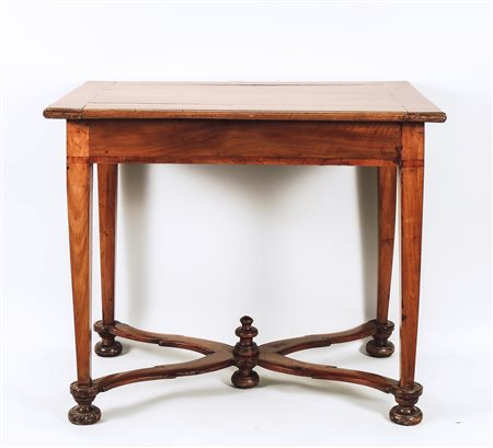 TAVOLO DA APPOGGIO IN NOCE E CILIEGIO - WALNUT AND CHERRYWOOD TABLE XIX secolo - 19th Century intarsiato con filettature, gambe a faretra riunite da traverse a crociera sagomate, piedi a palla schiacciata h cm 81x94x66,5