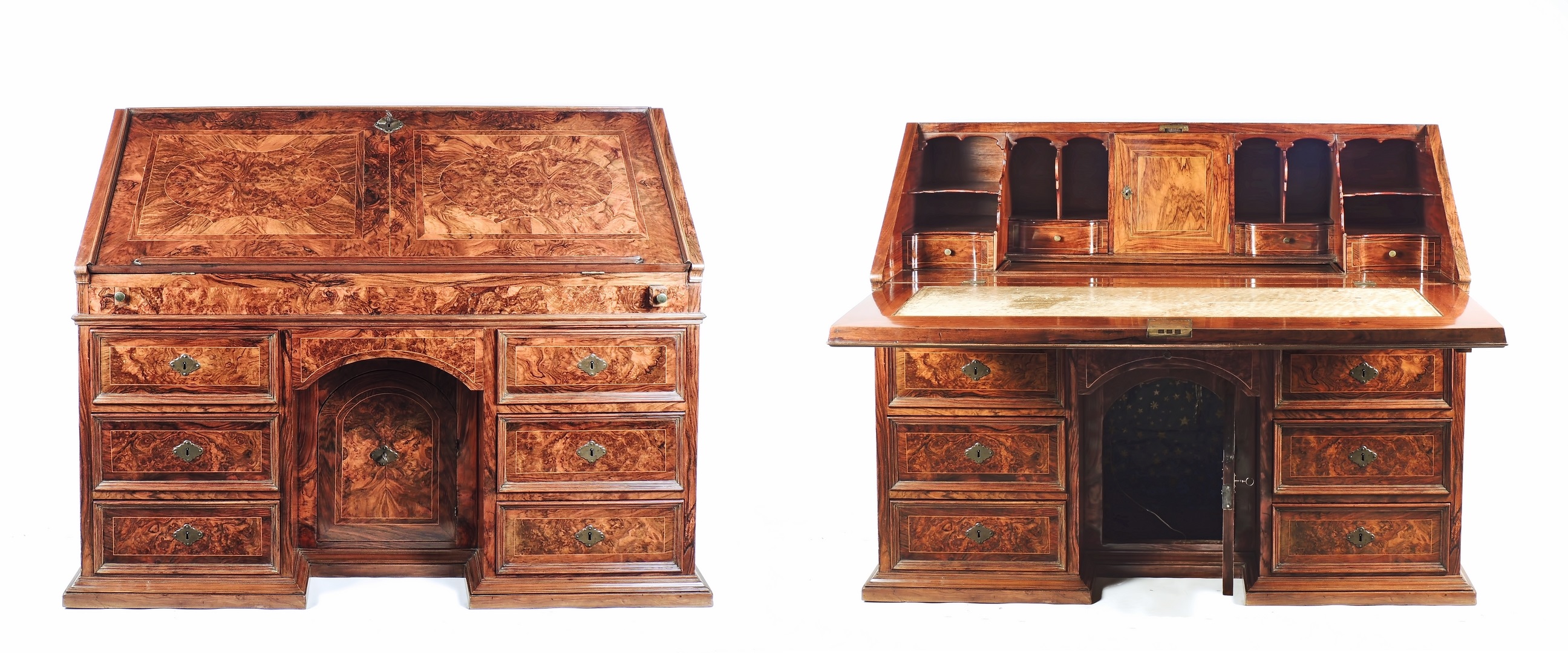 SCRIVANIA A RIBALTA DA CENTRO IMPIALLACCIATA IN RADICA DI TUJA E RADICA DI NOCE - BURR TUIA AND WALNUT VENEERED FALL FRONT BUREAU fine del XVIII secolo - Late 18th Century intarsiata con filettature in legni di frutto, sportello a calatoio a celare scarabattolo con vani, sportello, cassettini e segreto, sei cassetti laterali ed uno sportello centinato centrale sul fronte dritto, base a cornice non pertinente di epoca posteriore h cm 114x136x68