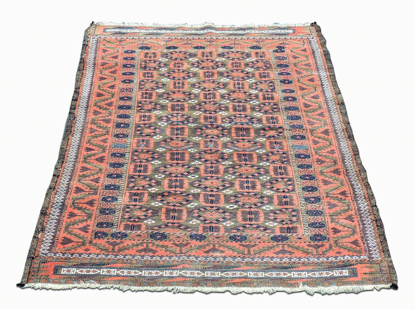 TAPPETO CAUCASICO - OLD CAUCASIAN RUG di vecchia manifattura, fondo marrone, campo a disegni geometrici nei toni del rosso, dell'avorio e del blu, lievi difetti cm 194x105