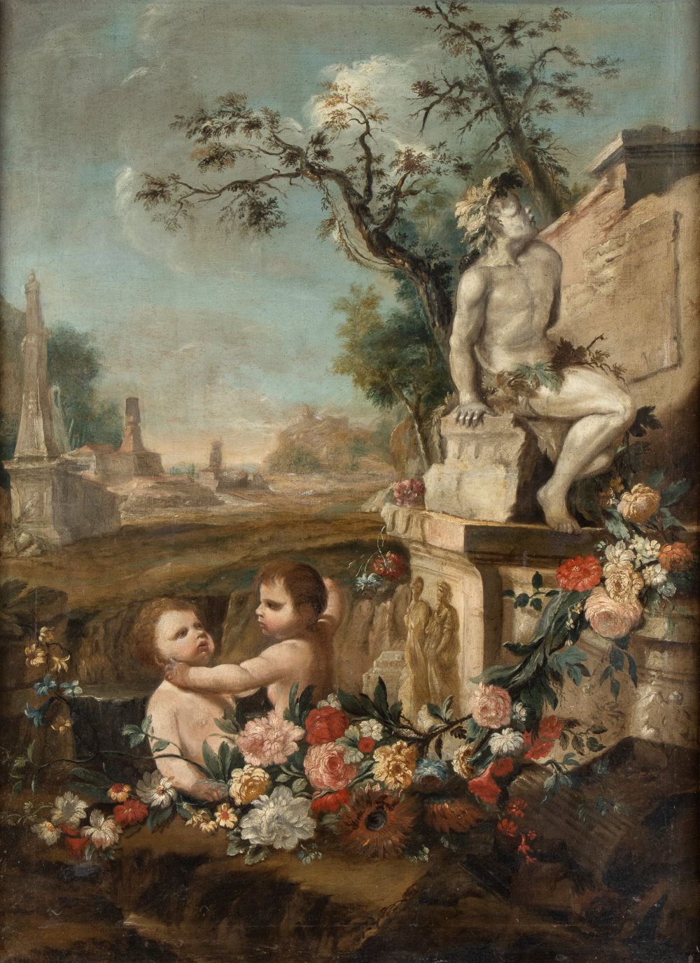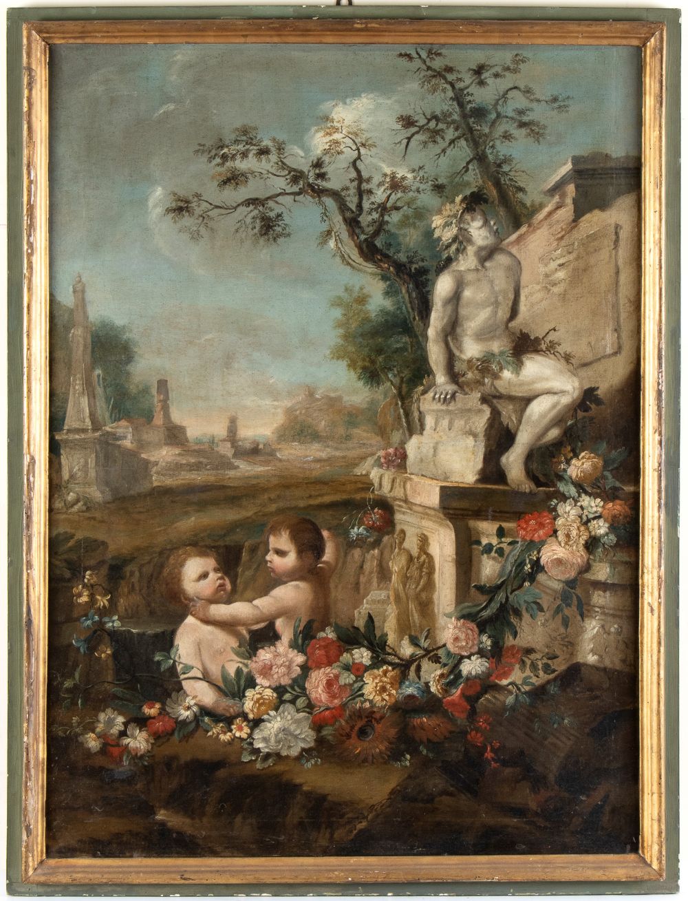 Scuola romana, XVIII secolo () Gioco di putti in un paesaggio con ruderi e...