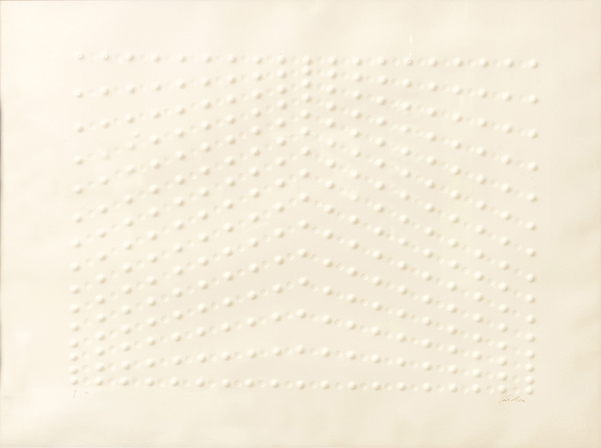 Enrico Castellani,Calcografia a secco, 45x60cm, Superficie bianca, 1969; 100 esemplari + 10 prove e 7 prove con lettere A/G impressione a secco per la cartella "Grafica '69" con opere di Baj, Bruni, Turcato, Ceroli, Guereschi, Morlotti, Pozzati, Sironi, Stefanoni. L'opera è una prova d'artista