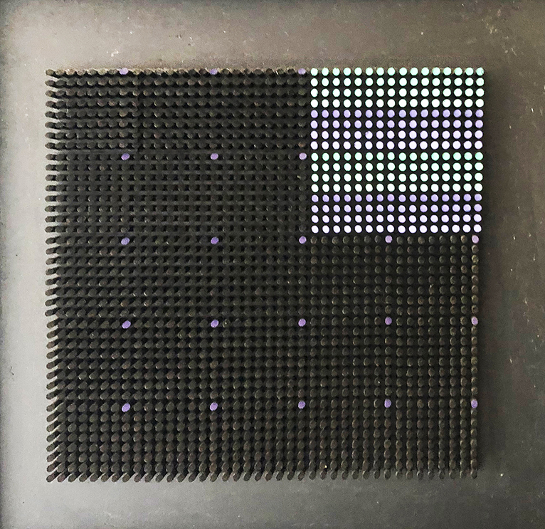 Franco Costalonga, Gradienti di luminosità (cilindretti in plastica) applicati su plastica riportata su faesite, 30x30cm, CIL V10 VSP, 2006; Autentica dell'artista su foto