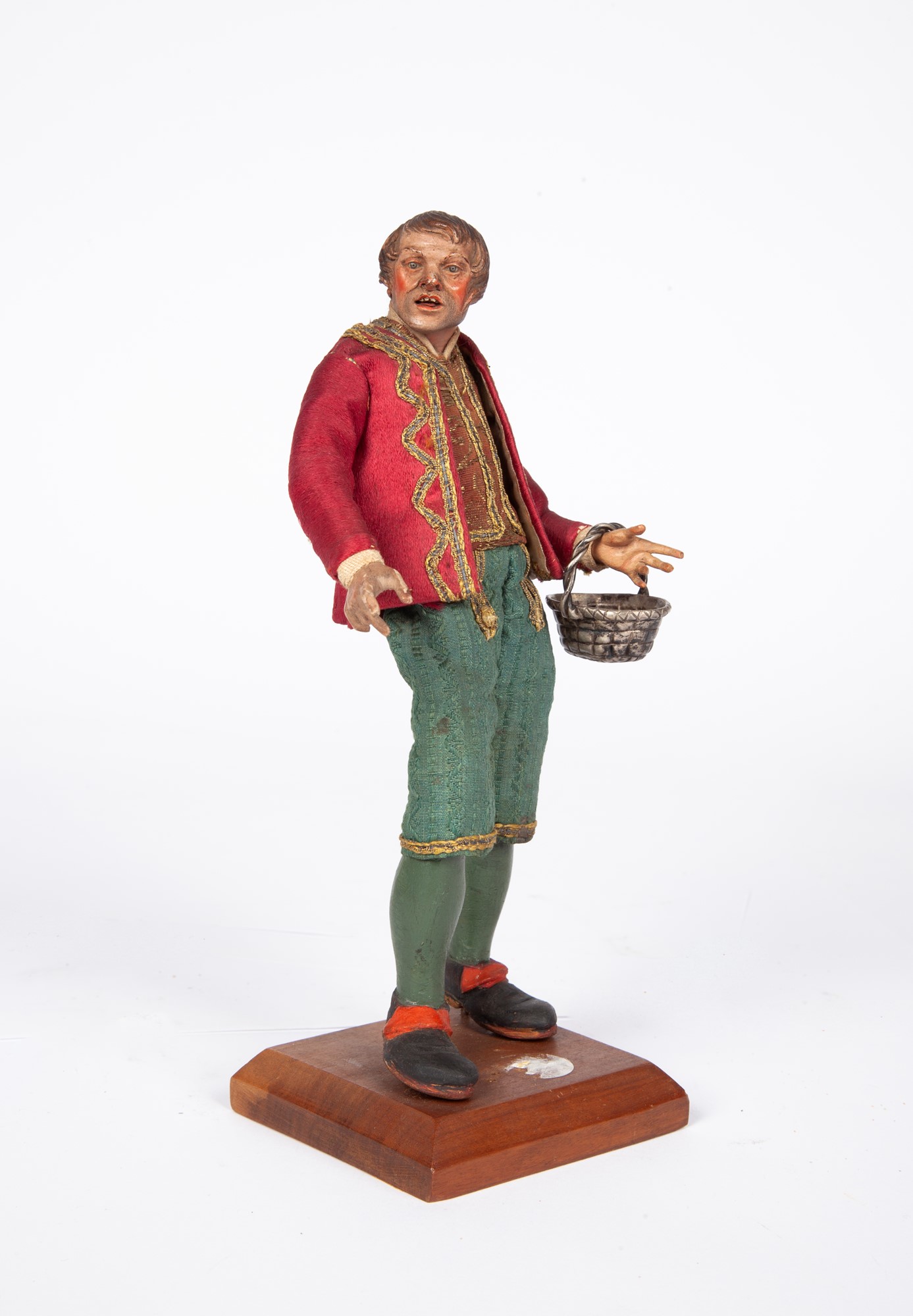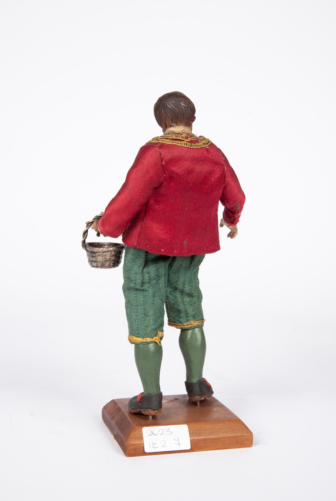 Mezzo carattere testa lievemente rivolta verso la spalla destra e bocca socchiusa; gilet e giacca rossa con gallonatura, pantaloni di tela azzurra. Accessori: cesta in metallo altezza complessiva cm 22