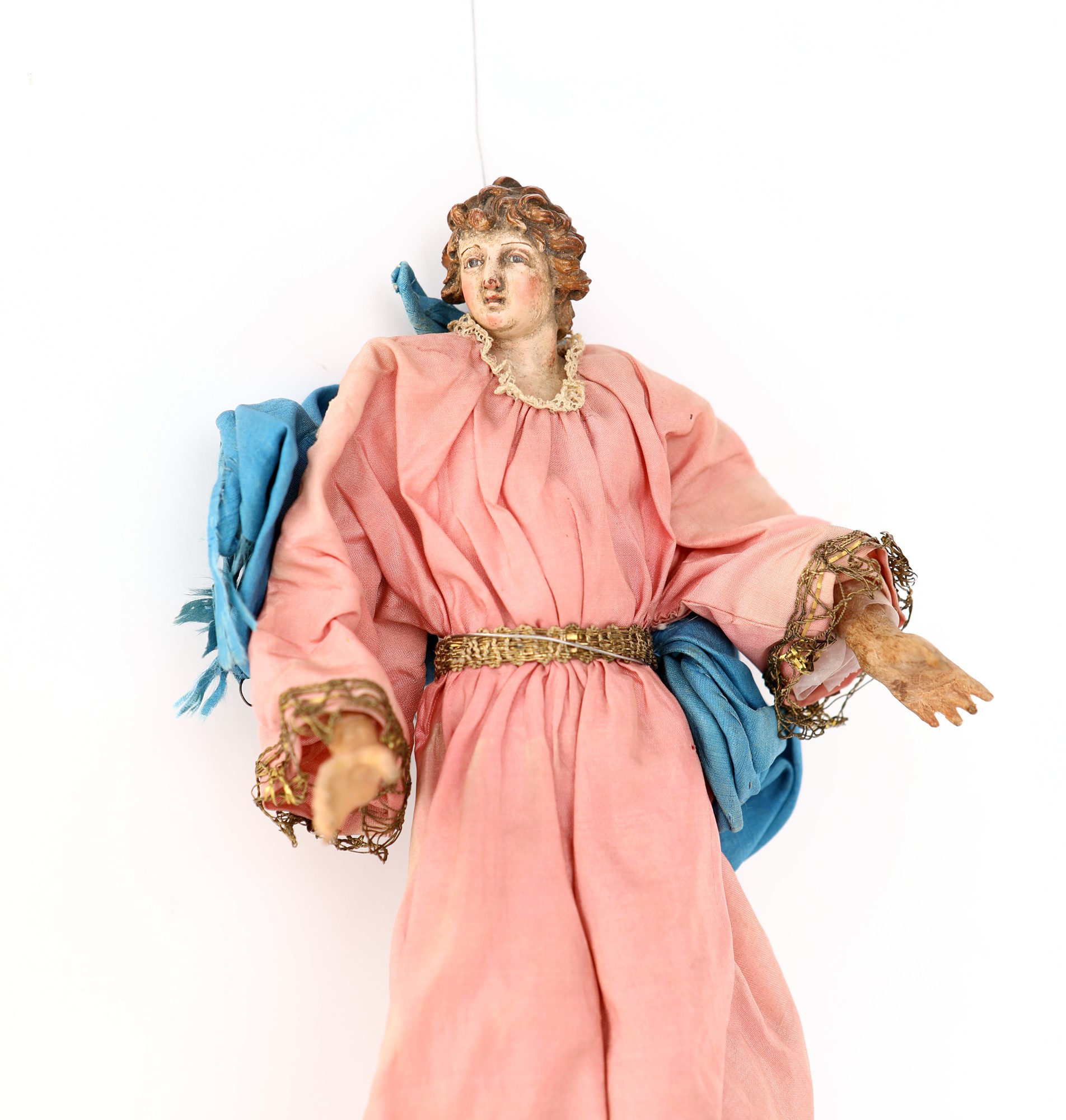 Angelo con tunica rosa ricami in oro, svolazzi azzurri. Difetti e restauri