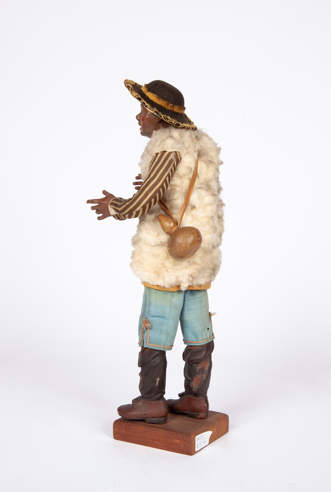 Viandante con bisaccia in pelle camicia bianca, giacca a righe, gilet di pecora, pantaloni azzurri al ginocchio, stivali. Accessori: cappello, bisaccia e caciocavallo altezza cm 34 - complessiva cm 37