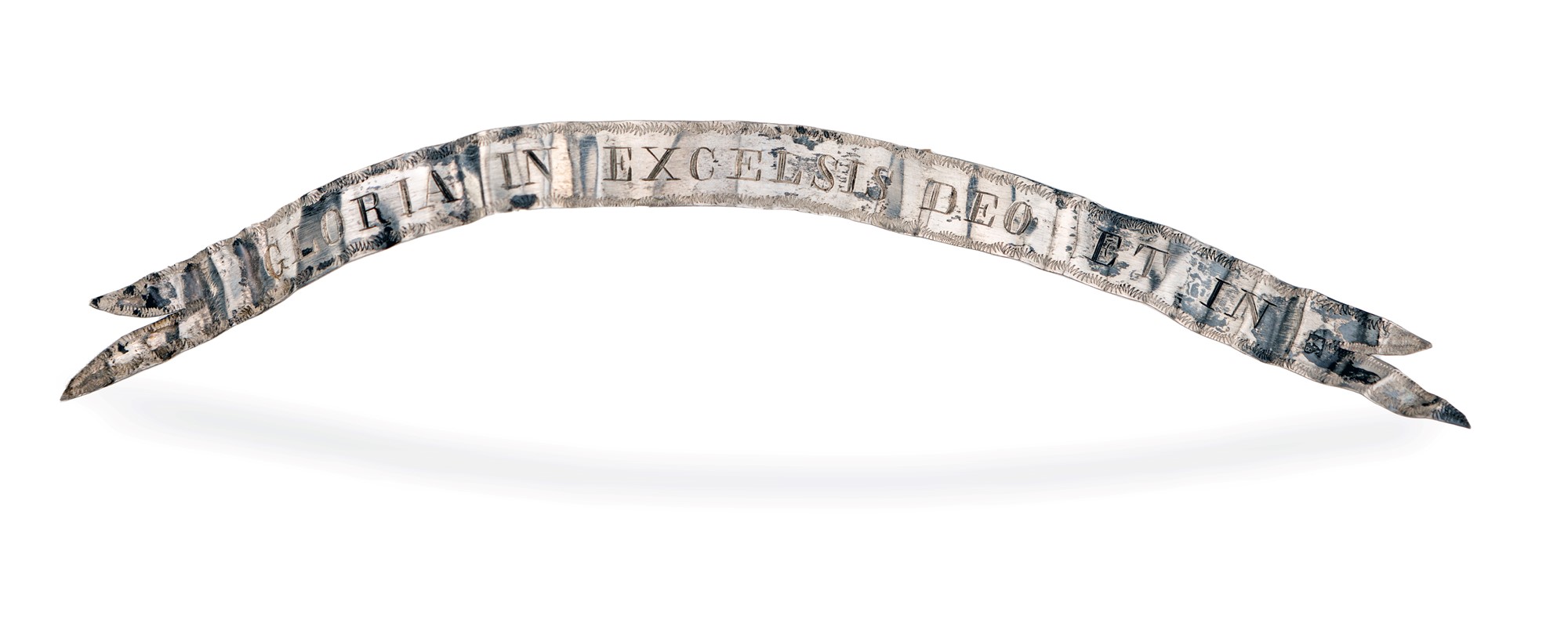 Nastro svolazzante in argento con iscrizione "Gloria in Excelsis Deo e in Terra"