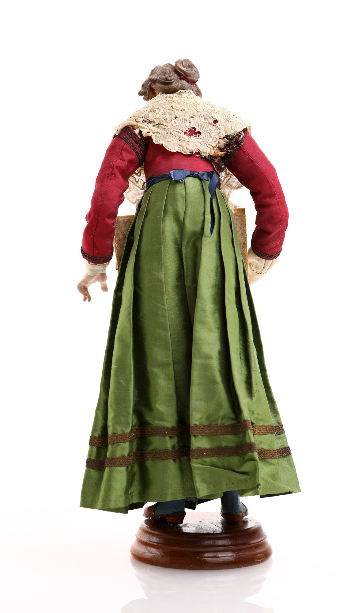 Donna ricca con chignon collana al collo, un orecchino a forma di fiore; camicia plissettata bianca, corpetto beige, scialle ricamato sulle spalle; corpetto rosso da cui escono i polsini della camicia, ampia gonna verde, sinale beige, pantofole ai piedi altezza cm 35,5