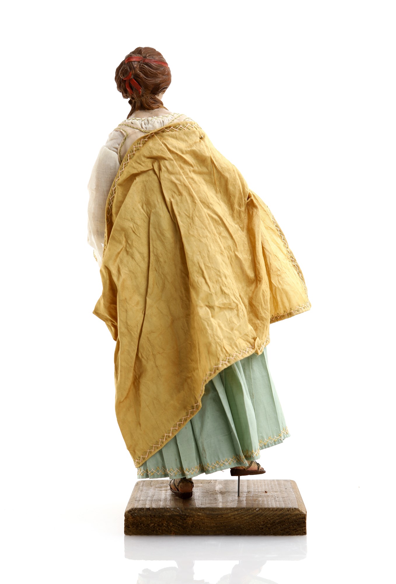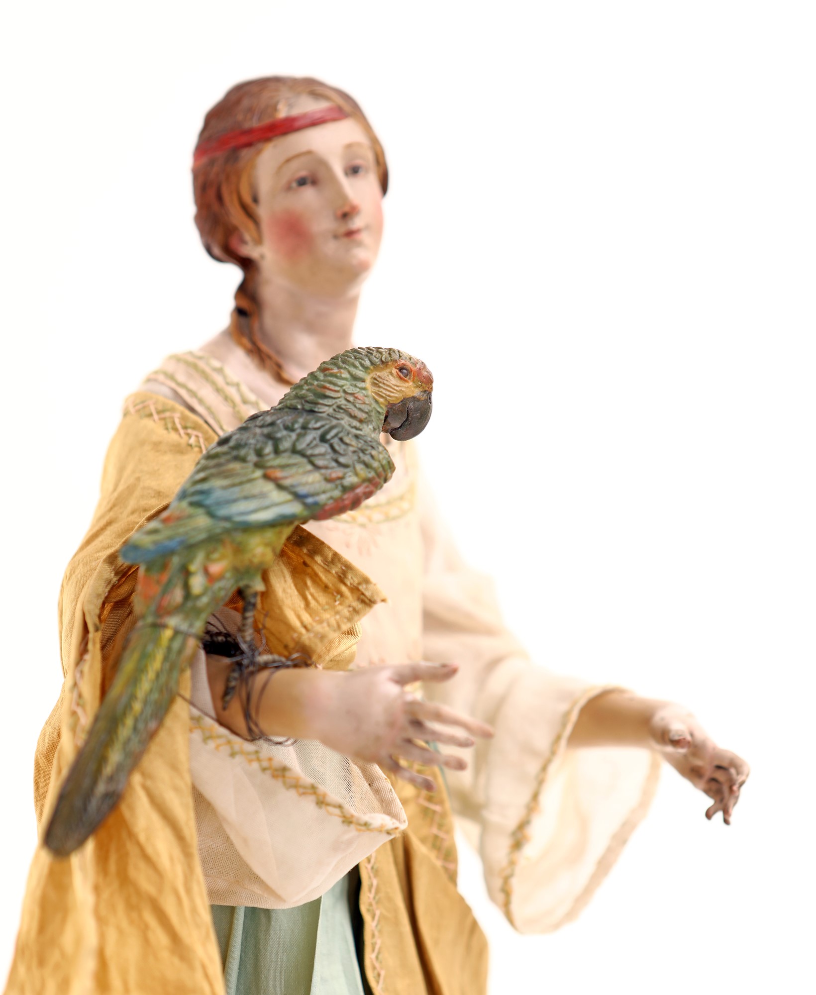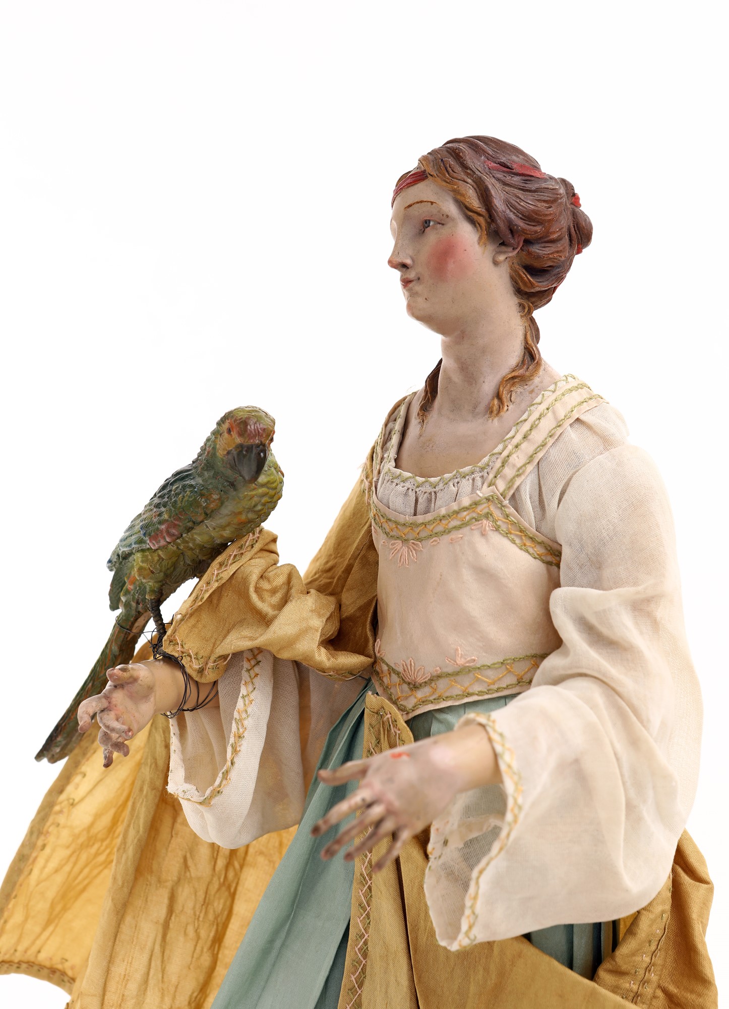 Samaritana con pappagallo sul braccio ricca capigliatura con nastro rosso secondo la moda dell'epoca, camicia plissettata in seta avorio, corpetto beige, ampia gonna azzurra a pieghe, mantello giallo, sandali ai piedi. Accessori: pappagallo in terracotta policroma con occhi di vetro altezza cm 40 - pappagallo cm 14