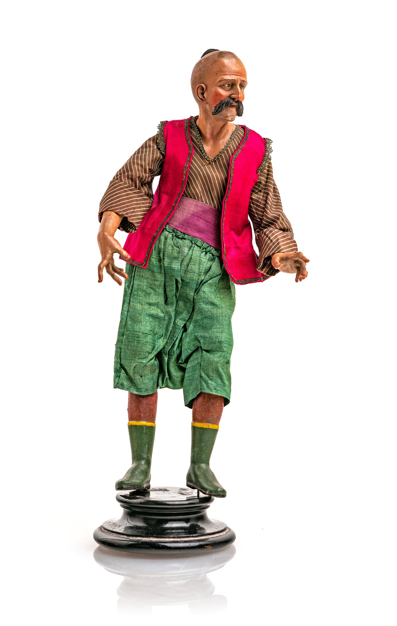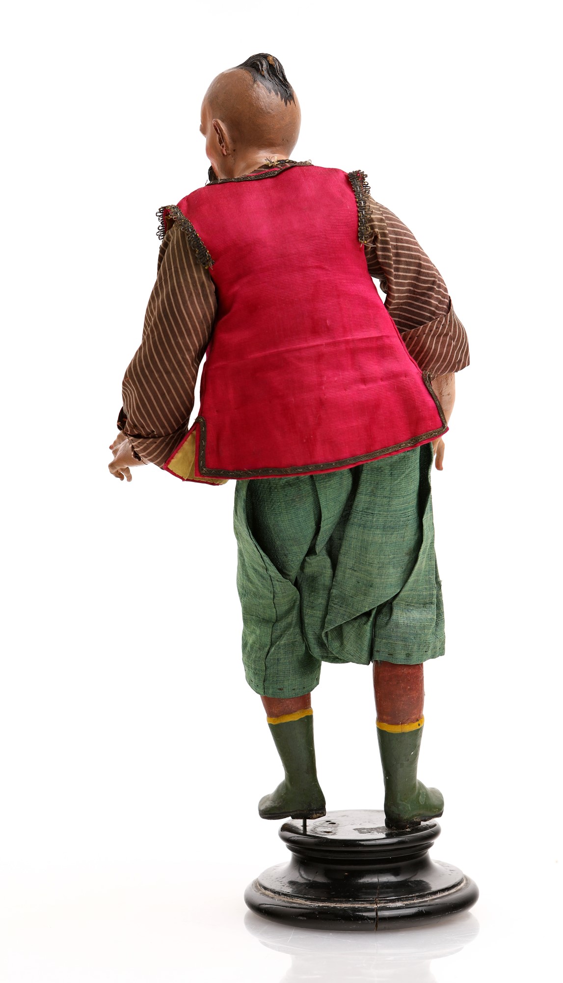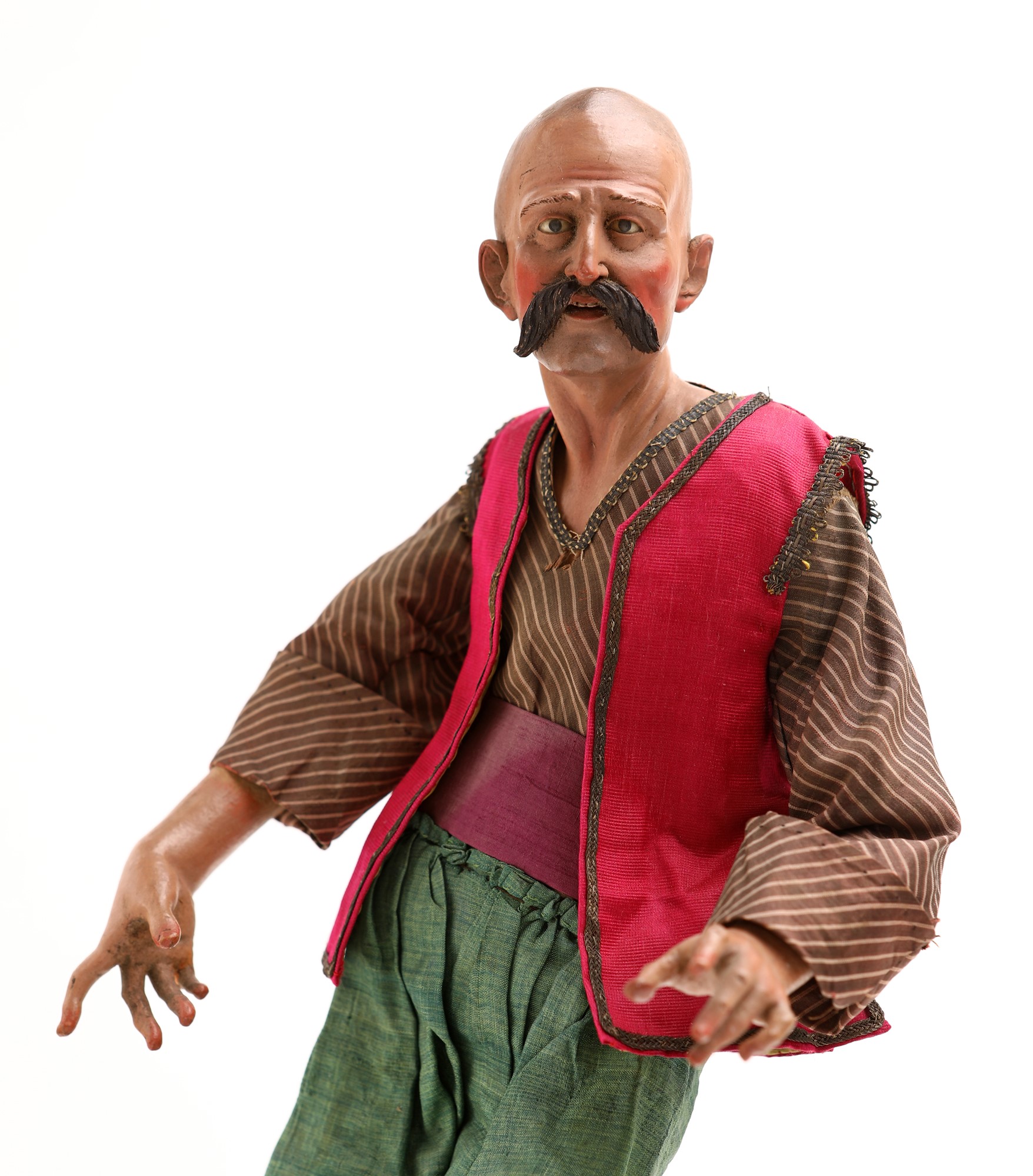 Orientale con codino e baffoni camicia marrone a righe, gilet rosso, fusciacca bordeaux a reggere pantaloni di seta verde. Stivali verdi bordati di giallo altezza cm 39
