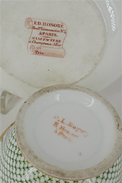 Manifattura Dagoty et Honorè, Parigi, secolo XIX. Lotto composto da una teiera con coperchio, lattiera e tazza con piatto in porcellana decorata a graticcio in verde con bordura in oro unito a una caffettiera con coperchio di simile decoro (h max cm 18,5) (difetti e restauri)
