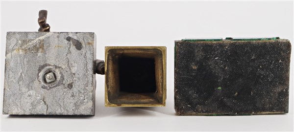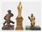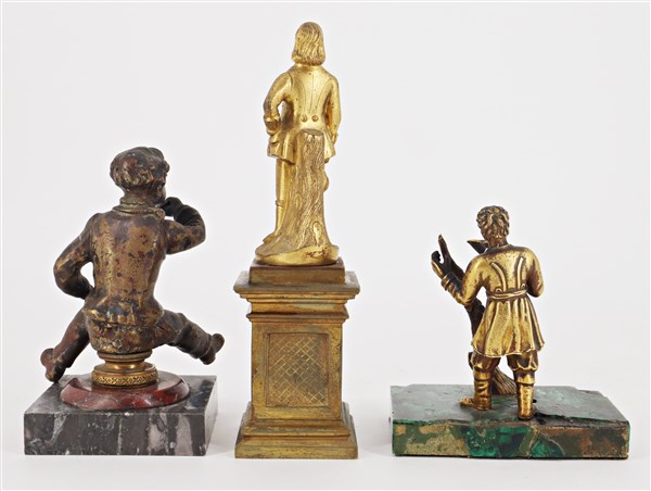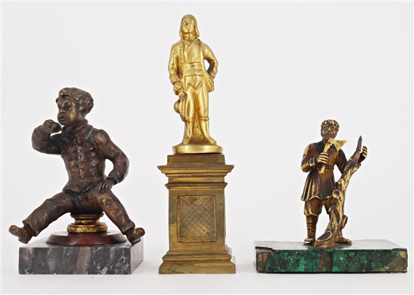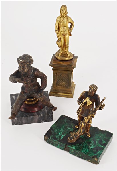 Lotto composto da tre diverse sculture in bronzo raffiguranti gentiluomo con cappello, taglialegna e fanciullo. Uno con base rivestita in malachite (h max cm 19) (difetti e mancanze)