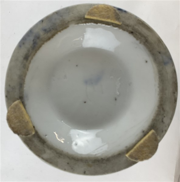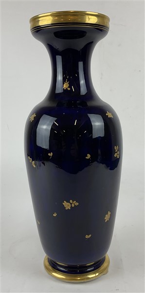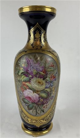 Manifattura del secolo XIX. Vaso in porcellana dipinta in policromia a mazzo di fiori entro riserva su fondo blu con bordure in oro (h cm 41,4) (lievi difetti)