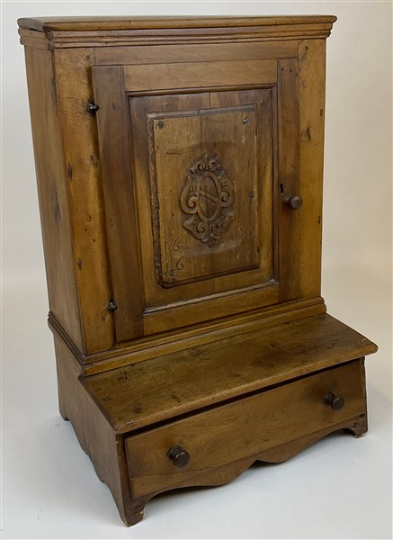 Inginocchiatoio in legni vari con fronte a un cassetto e ante pannellata decorata da intaglio. Costruito con elementi antichi (cm 56x81x41) (difetti)