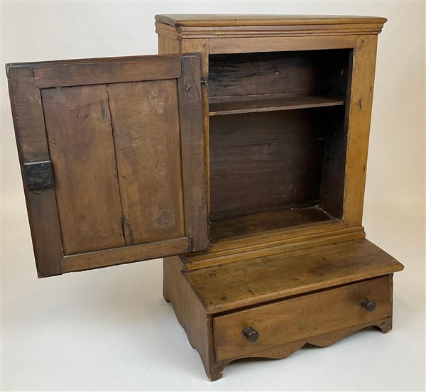 Inginocchiatoio in legni vari con fronte a un cassetto e ante pannellata decora