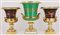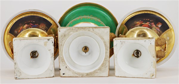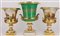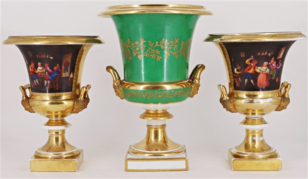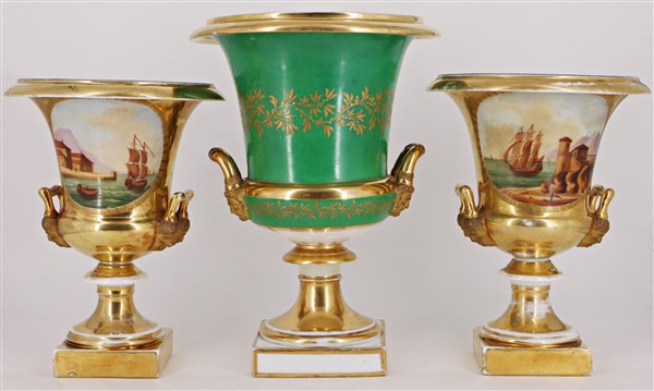 Manifattura del secolo XIX. Lotto composto da coppia di vasi Medici in porcellana, anse con attaccature a mascheroni, decorati in policromia con scene di feste in un interno e paesggio marino in policromia su fondo oro. Unito a un vaso di forma similare con decori a foglie su fondo verde e oro (h max cm 32) (lievi difetti)