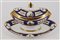 Manifattura Halley, Parigi, inizio secolo XIX. Salsiera con coperchio in porcellana a navicella, anse a volti muliebri, decori in policromia a vasi e motivi floreali entro riserve con bordure in blu e oro (L cm 26) (lievi difetti)