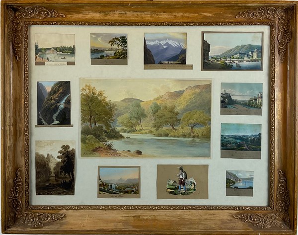 Gruppo di undici acquerelli del secolo XIX di autori differenti raffiguranti paesaggi svizzeri e contadini, in un'unica cornice (cm tot. 60x76) (difetti)