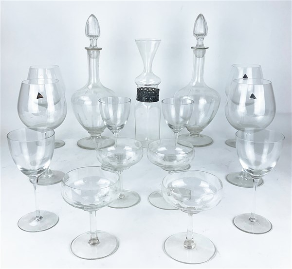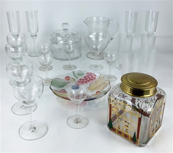 Tre cartoni contenenti numerosi oggetti, tra cui bicchieri e bottiglie in vetro e cristallo di differente manifattura (difetti)