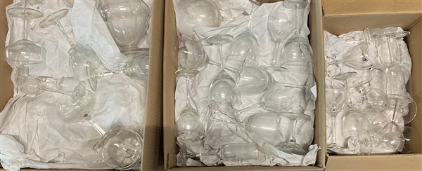 Tre cartoni contenenti numerosi oggetti, tra cui bicchieri e bottiglie in vetro