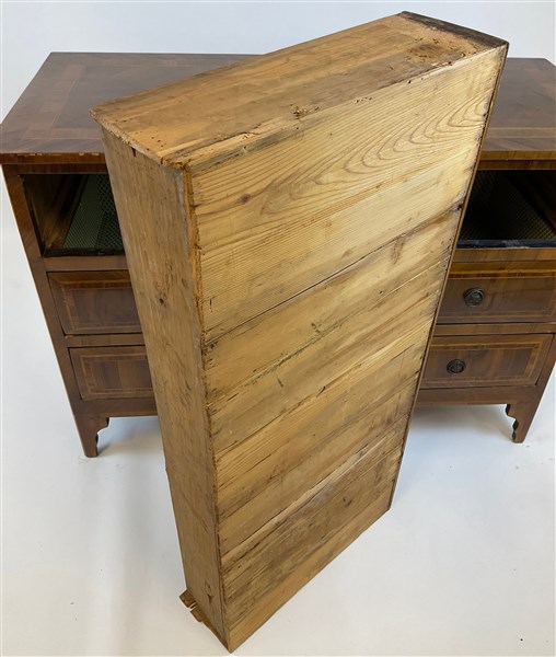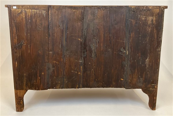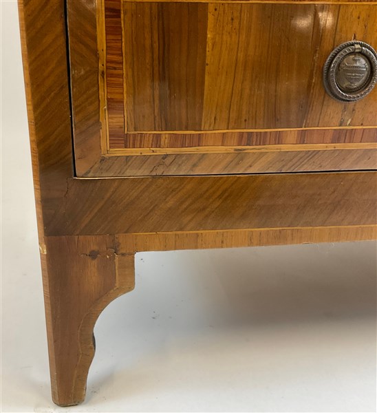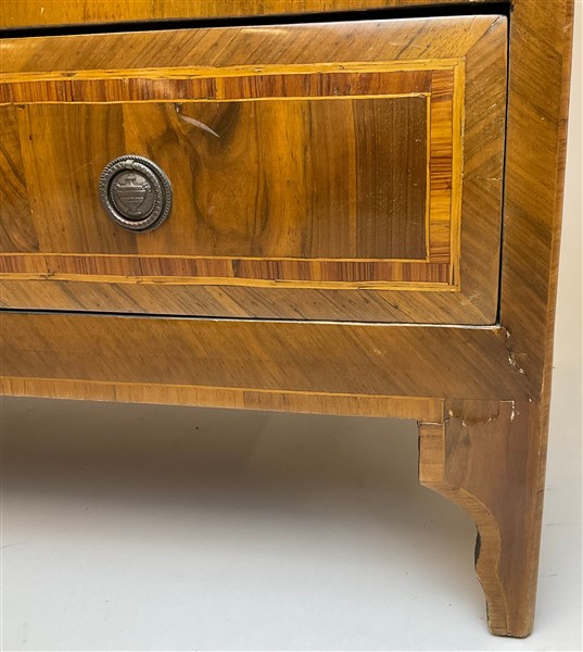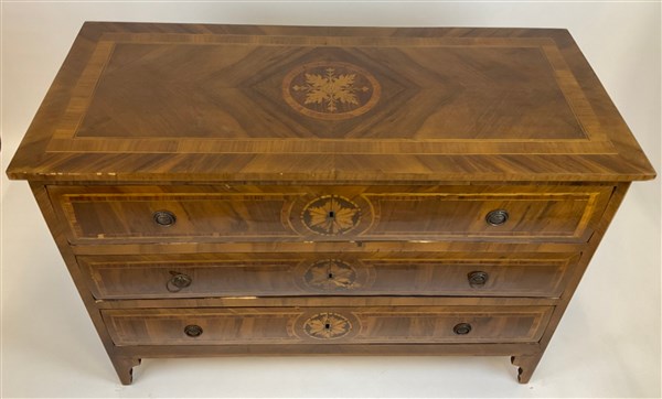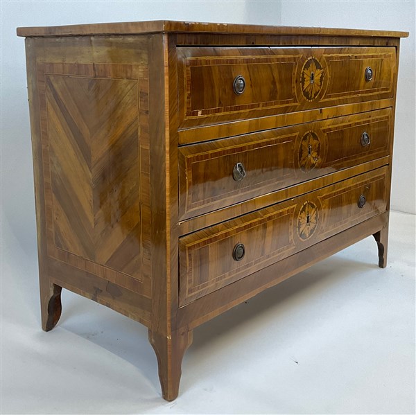 Cassettone lastronato in noce e filettato in bois de rose, tre cassetti sul fronte centrati come il piano da rosone in legno chiaro. Lombardia, fine secolo XVIII, inizio secolo XIX (cm 123x87x55) (difetti e restauri)