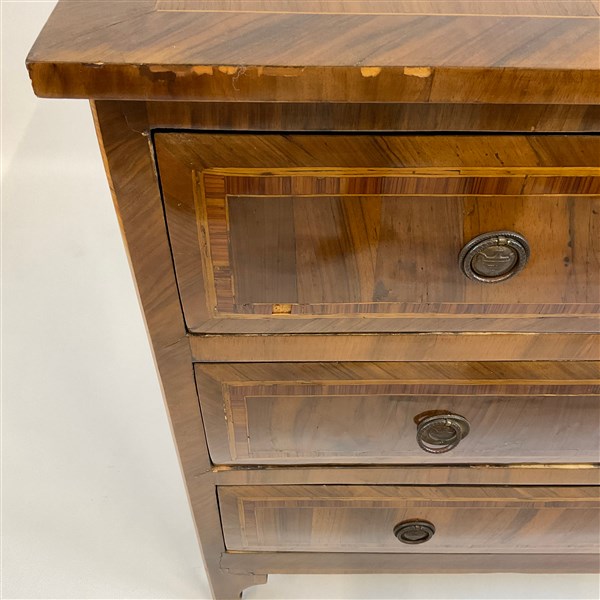 Cassettone lastronato in noce e filettato in bois de rose, tre cassetti sul fro