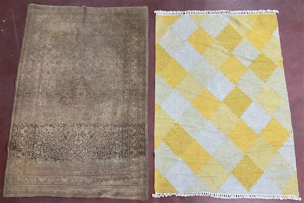 Lotto di due tappeti : uno persiano, secolo XX; l'altro tessuto di recente manifattura con decoro a rombi ; misure differenti (difetti)