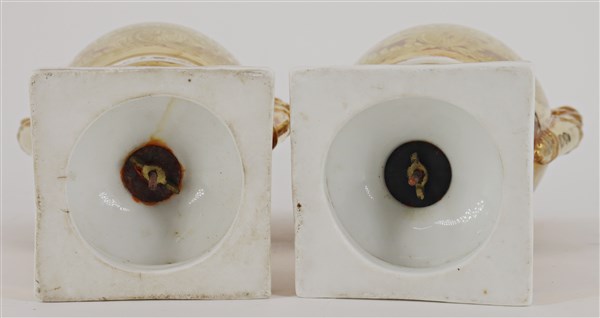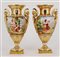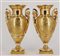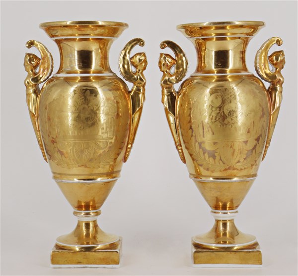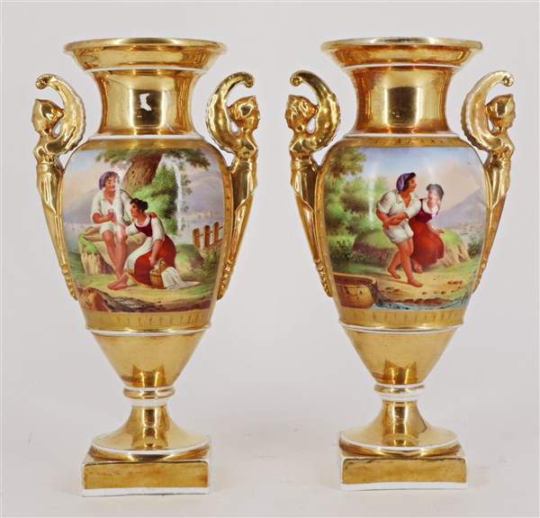 Manifattura francese, inizio del secolo XIX, decorazione eseguita a Napoli, probabile atelier di Giovine. Coppia di vasi in porcellana con corpo ovoidale ed anse a erma alata, dipinti in policromia sul fronte entro riserva con scene di corteggiamento e paesaggio costiero di cui una col Vesuvio, fondo in oro (h. cm 27) (difetti)