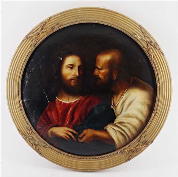 Lot 1150 | Ignoto, antico dipinto raffigurante "Il tributo" olio su cartone (diametro 29,