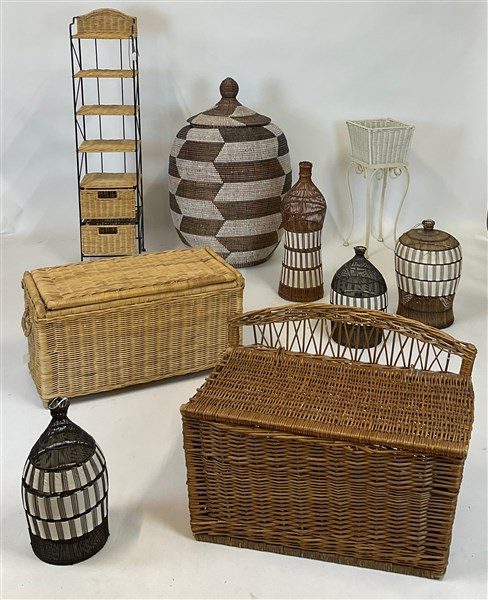 Lotto composto da quattro nasse, due bauli, un'etagère, un portavaso e un vaso con coperchio in materiali vari (h max cm 122) (difetti)