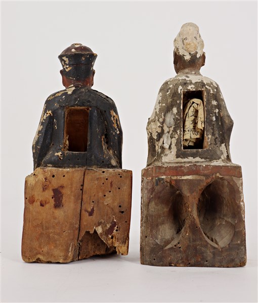 Due figure di dignitari in legno intagliato e dipinto in stile Ming Cina, seco