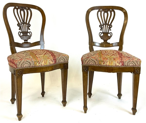 Coppia di sedie in legno con schienale intagliato a vaso con volute, gambe rastremate (difetti)